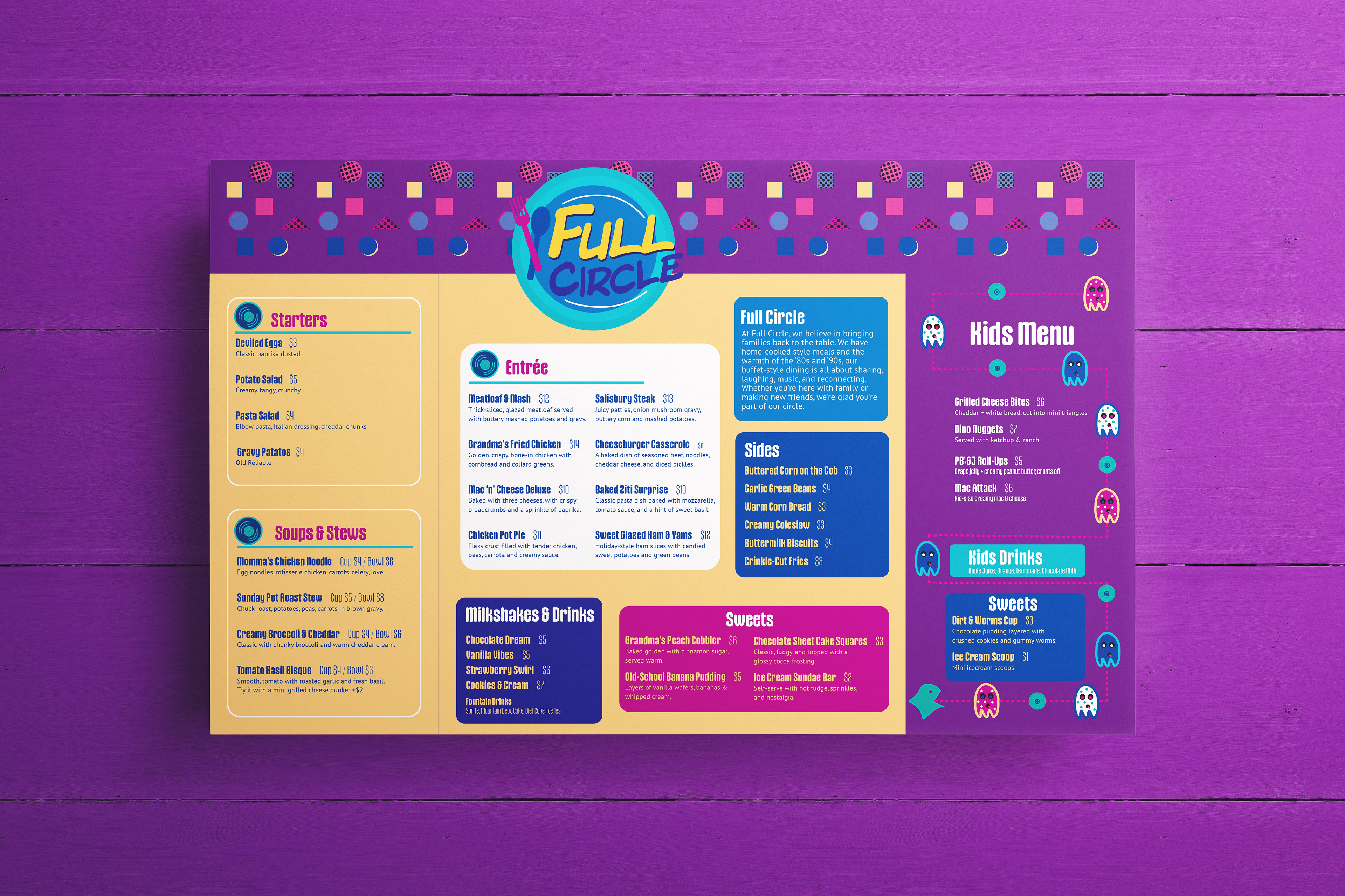 Full Circle is a restaurant branding project that centers around the idea of continuity, unity, and family oriented. The design focuses on creating a cohesive identity built on circular motifs and fluid visual elements that reinforce the brand name. The menu system emphasizes readability and hierarchy, allowing customers to easily navigate food selections while still experiencing a polished, modern design aesthetic. Colors and typography were intentionally chosen to communicate warmth and sophistication. The overall system creates a memorable dining brand with a clear conceptual foundation.